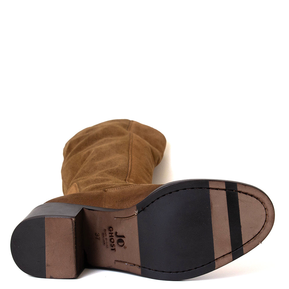 Jasmine is a women's suede knee-high boot from Jo Ghost. Made in Italy, in premium suede leather. This boot is leather-lined with a leather footbed. Jasmine has a 16-inch shaft. The leather sole stands tall on a 2½ inch heel with a durable anti-skid rubber heel tap and outsole. This shoe runs slightly large. If between sizes please choose the smaller size.