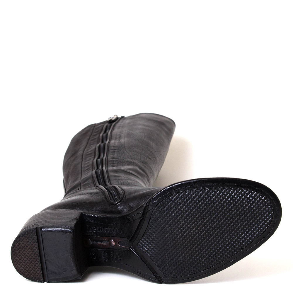 Atena 4A is a women's leather knee-high boot from Lemargo. Made in Italy, in premium leather. This boot is leather-lined with a leather footbed and has an inner zipper. The leather sole stands on a 2-inch heel with a durable anti-skid rubber heel tap and outsole. This shoe runs slightly large. If between sizes please choose the smaller size.
