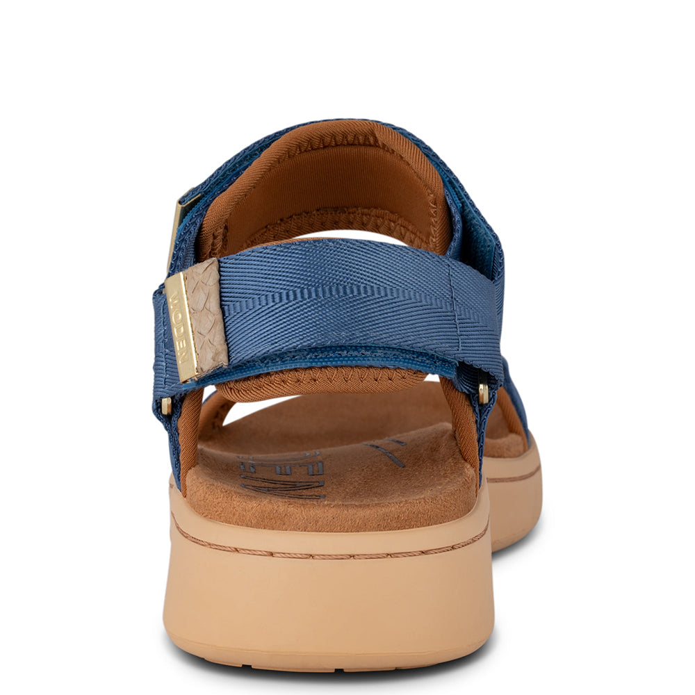 Line is a women's sandal from Woden. Designed in Scandinavia, in premium mixed material. It has adjustable velcro straps and a fish leather detail. The breathability of these sandals is ensured by the use of a rubber outsole with natural soft technology. This shoe runs true to size. Please choose the size you normally wear.